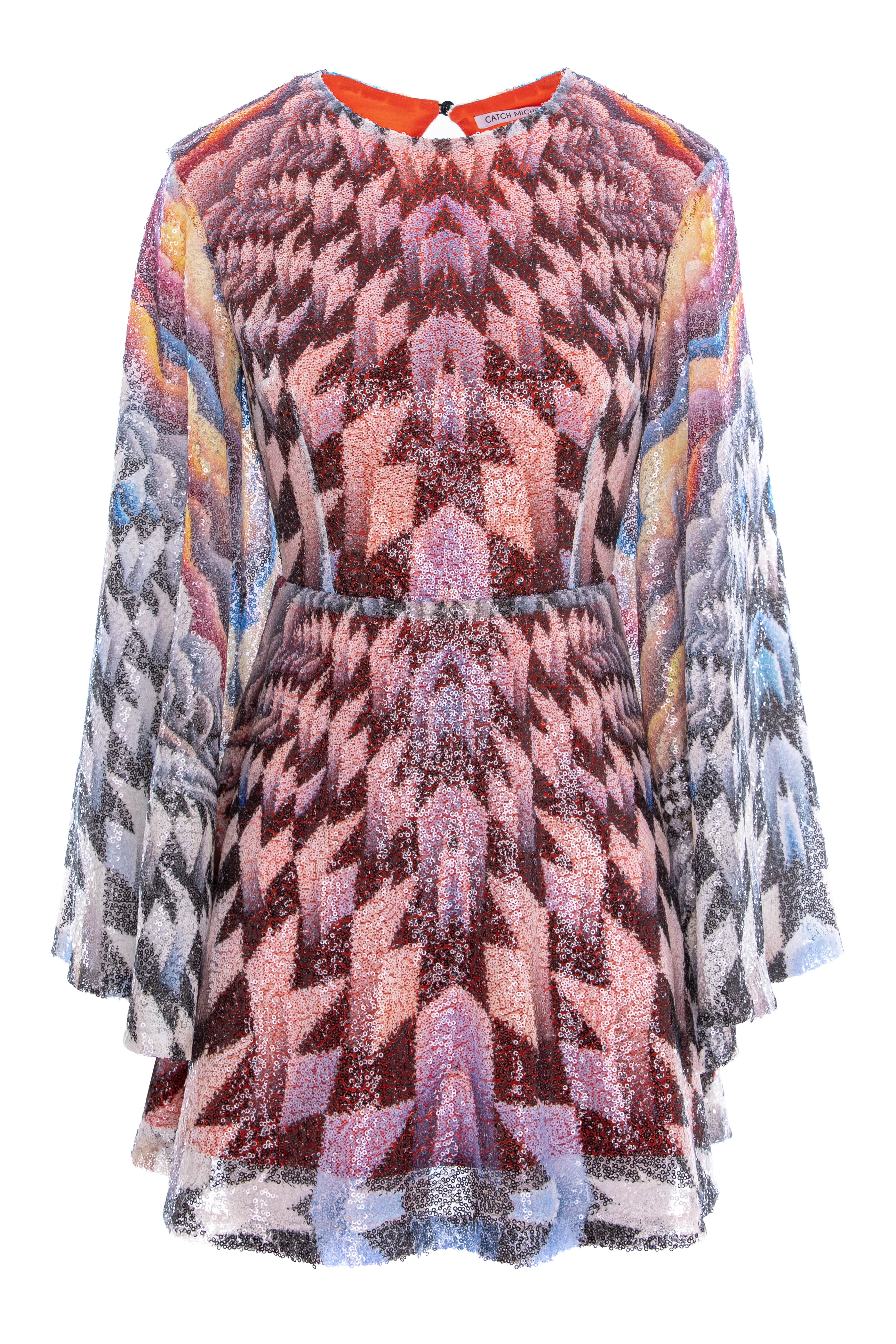 This short, retro-style dress channels the glamour and energy of Studio 54, with a playful, bold print that captures the essence of disco-era chic.