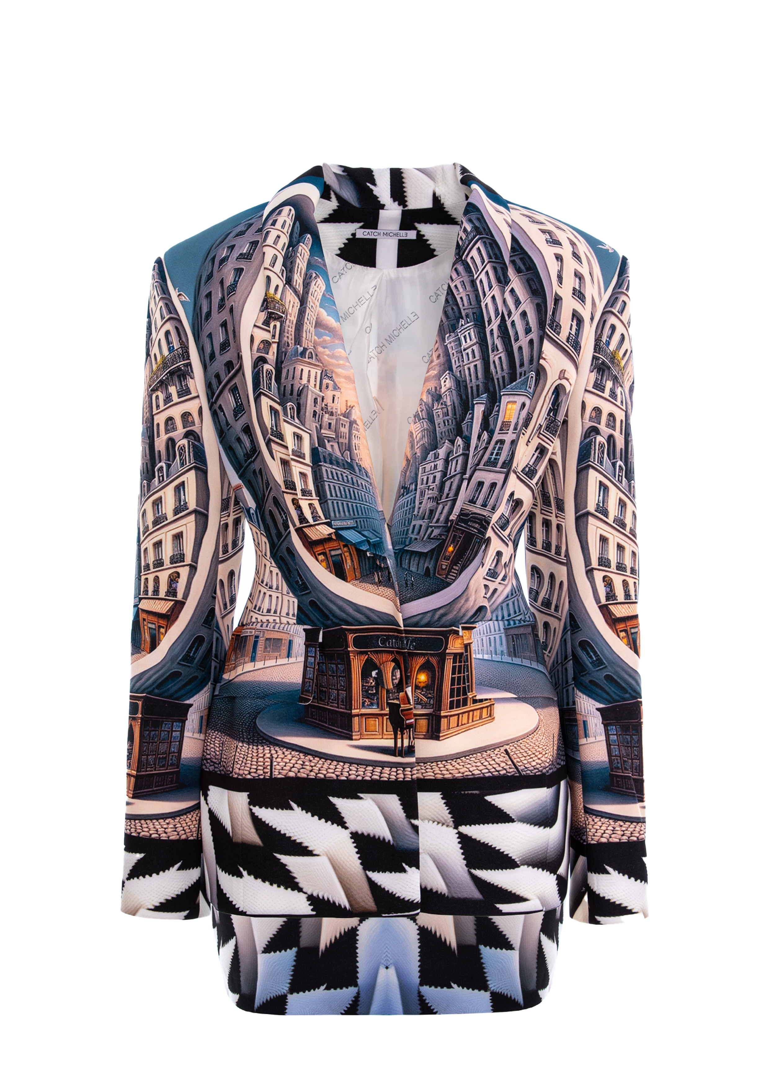 Make a bold statement with this fitted surrealist print jacket, designed to create an entire image through its unique, artistic pattern.