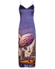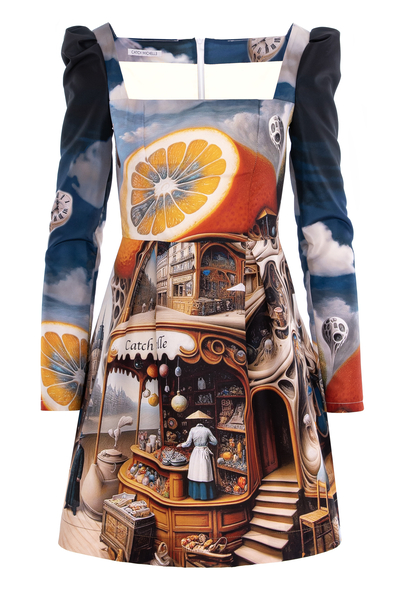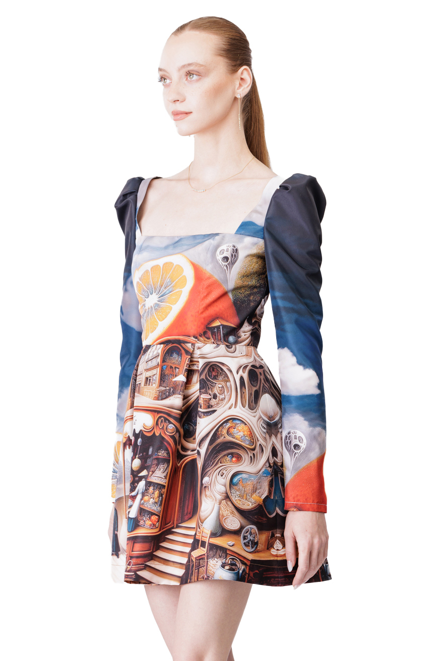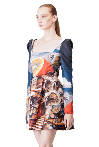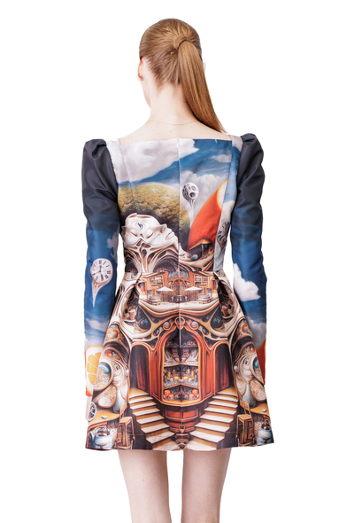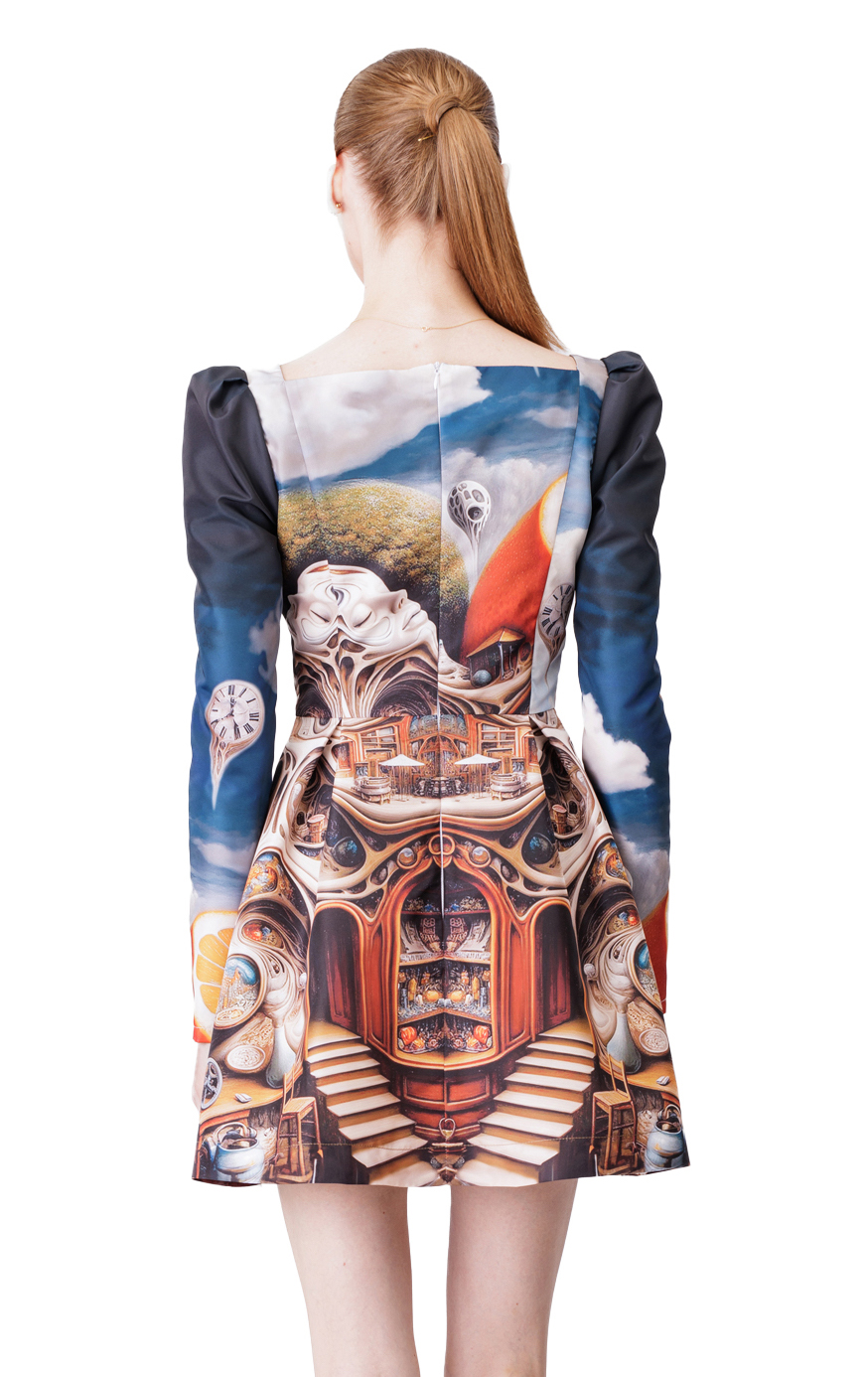 Featuring a flattering fit-and-flare silhouette, it showcases a captivating surrealist print that adds a touch of artistic whimsy to its classic design.